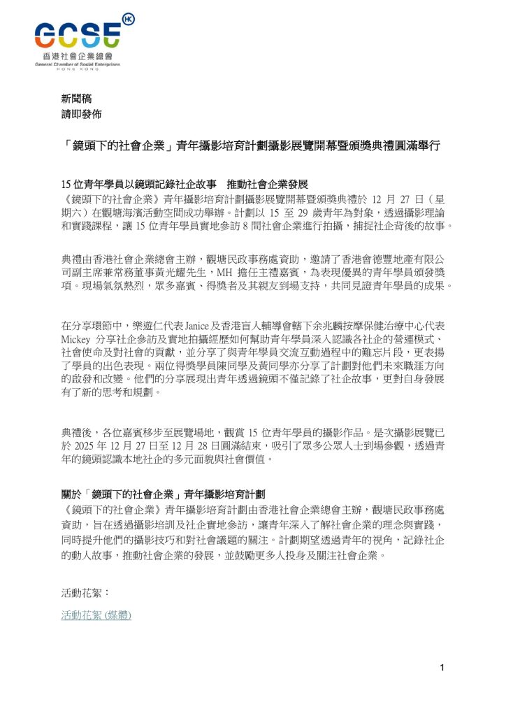 典禮後,各位嘉賓移步至展覽場地,觀賞15位青年學員的攝影作品。是次攝影展覽已於2025年12月27日至12月28日圓滿結束,吸引了眾多公眾人士到場參觀,透過青年的鏡頭認識本地社企的多元面貌與社會價值。