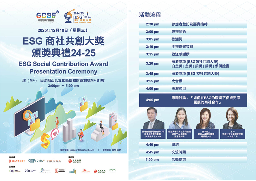 首屆「ESG商社共創大獎」,旨在表揚企業、學校及機構優先採購本地社企產品及服務,積極推動商社合作。自計劃推出以來反應熱烈,眾多機構已積極參與並給予支持。參與企業不僅能履行社會責任,更可直接轉化為ESG報告中的「社會(S)」貢獻實踐成果,並獲得ESG專屬評鑑摘要優化報告、提升品牌知名度、競逐獎項殊榮,以及建立長期ESG合作生態圈。