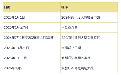 - 2024-25年度「ESG商社共創大獎」頒獎典禮暫定於 2026年3月9日舉行。