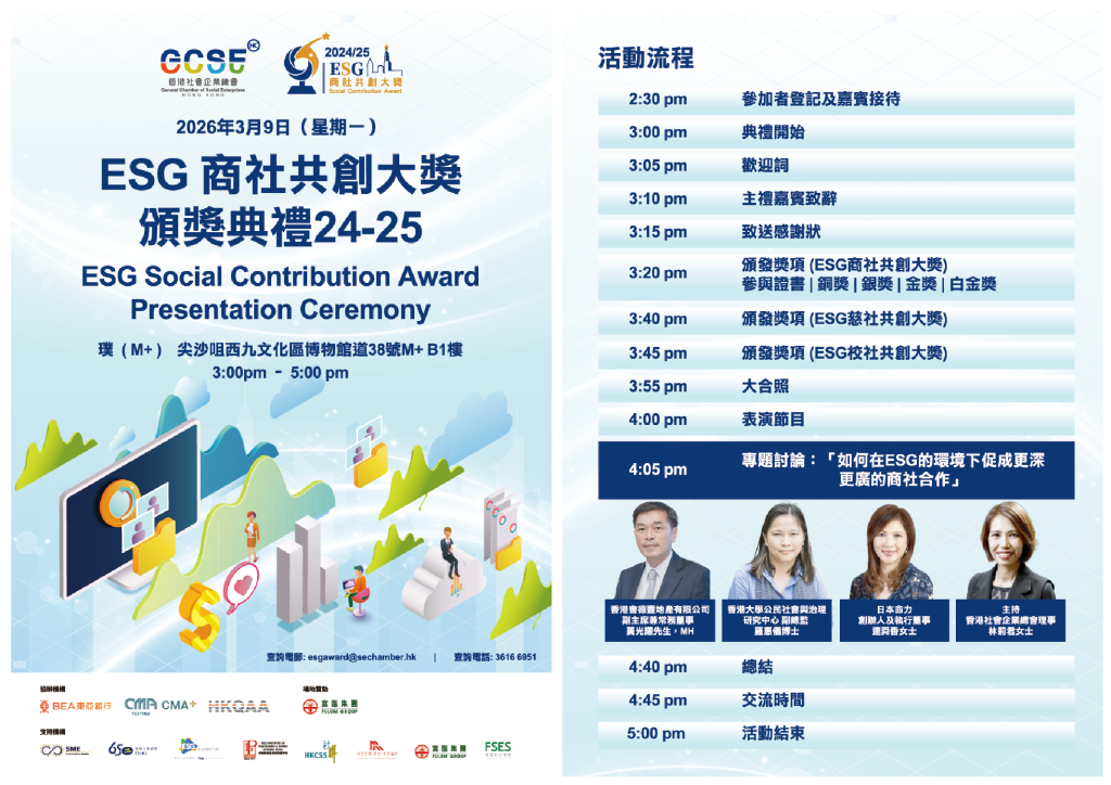 首届「ESG商社共创大奖」,旨在表扬企业、学校及机构优先采购本地社企产品及服务,积极推动商社合作。自计划推出以来反应热烈,众多机构已积极参与并给予支持。参与企业不仅能履行社会责任,更可直接转化为ESG报告中的「社会(S)」贡献实践成果,并获得ESG专属评鉴摘要优化报告、提升品牌知名度、竞逐奖项殊荣,以及建立长期ESG合作生态圈。